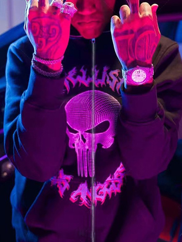 Único Diseño: la sudadera con capucha presenta estampados de calaveras geniales y roqueras que emanan un fuerte ambiente urbano y hip pop, lo que la convierte en una pieza destacada en su guardarropa.